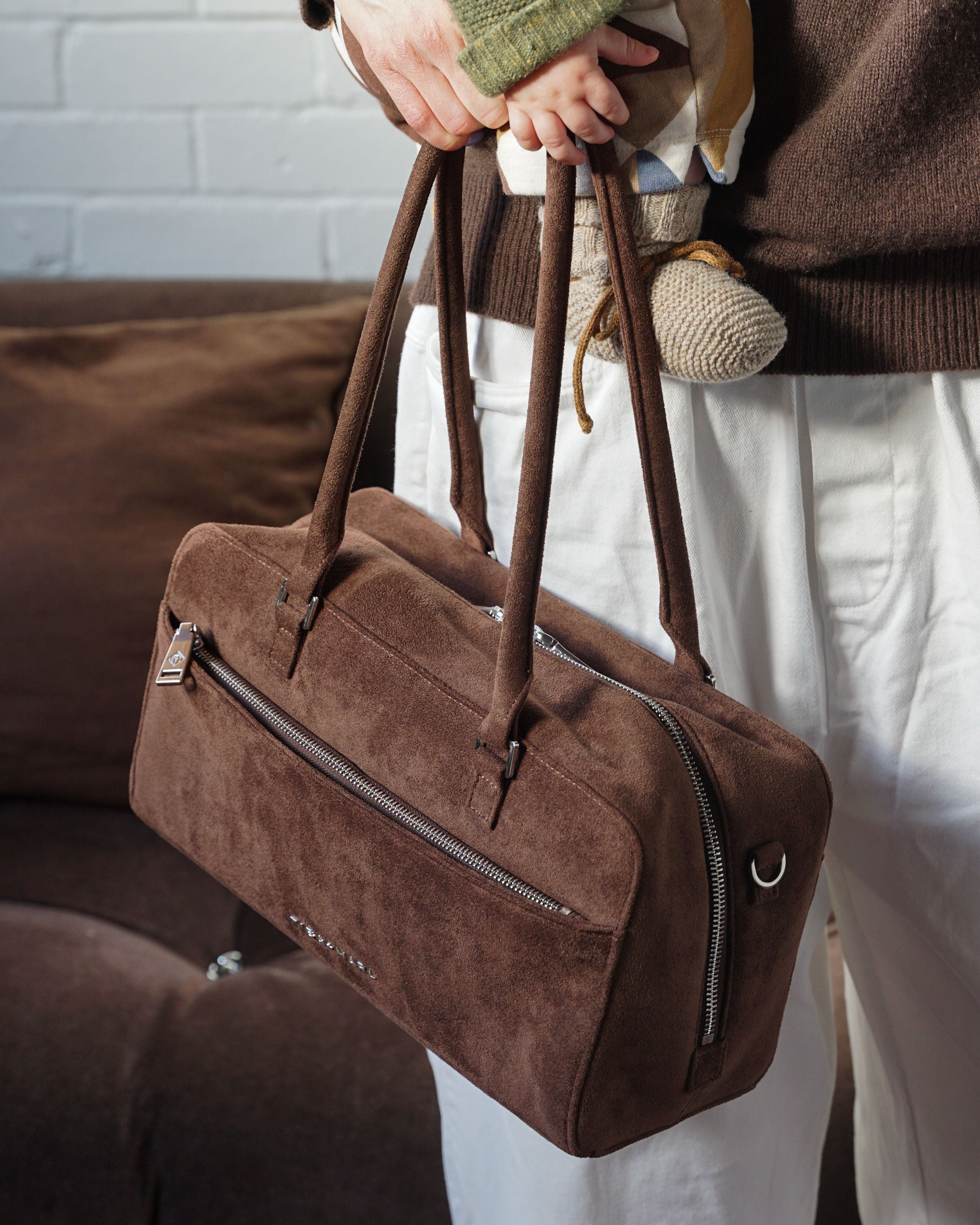 The RILEY east–west holdall brings a clean, minimalist exterior that wouldn’t look out of place on your shoulder—baby or not. Crafted from vegan suede with recycled lining, it’s lightweight, consciously made and set back to premium silver hardware for a directional, style-led edge.